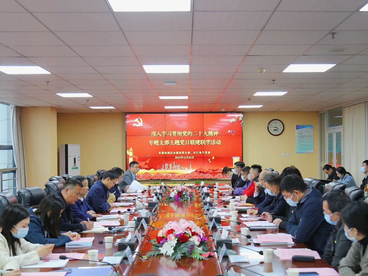 為堅決貫徹黨中央精神和省委、市委、高新區黨工委相關工作部署,積極營造學習貫徹黨的二十大精神熱潮,確保黨的二十大精神傳達到每一個黨員,切實把黨員思想行動統一到黨的二十大精神上來,11月16日,東湖高新區企服局黨支部聯合長江電氣黨委深入開展學習貫徹黨的二十大精神專題支部主題黨日聯建聯學活動。東湖高新區管委會機關黨委書記晏德孝出席活動并講話,區企服局黨支部書記余季生主持會議并以“深入學習貫徹黨的二十大精神,奮力推進東湖高新區區域經濟高質量發展”為主題講黨課,長江電氣黨委書記、董事長王新城,光谷數字經濟黨建聯盟、省科投、信通院(武漢)、長江電氣、達夢數據庫、斗魚、傳神語聯網、長江鯤鵬生態創新中心等8家企業黨員代表,東湖高新區管委會機關黨委、工委組織部黨員代表,企服局黨支部全體黨員干部參加活動。