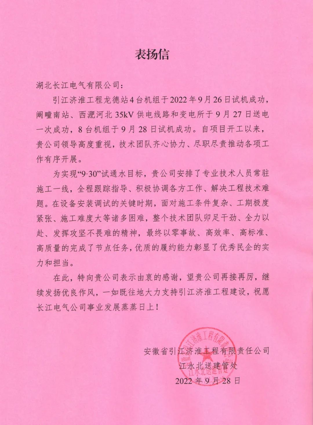 9月26日-28日,引江濟淮工程龍德站4臺機組試機成功,闞疃南站、西淝河北35kV供電線路和變電所送電一次成功,8臺機組試機成功。長江電氣作為這三個站的主要電氣設備生產單位,接到安徽省引江濟淮集團有限公司發來的表揚信,信中對項目開工以來,長江電氣領導高度重視、技術團隊齊心協力、盡職盡責,保質保量推動各項工作有序開展,給予充分肯定和贊揚。